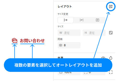 複数の要素を選択してデザインパネル内「レイアウト」の横の+ボタン、または右クリックでオートレイアウトを追加(Shift+A)してオートレイアウトの設定画面を表示させます。