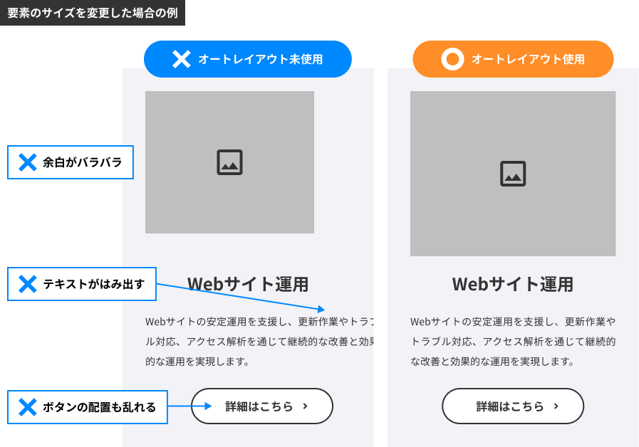 そもそもオートレイアウト機能を使っていないと、修正時に余白や配置の再設定が必要になります。