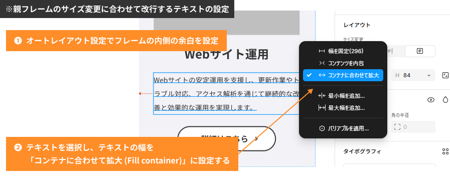 複数行のテキストが含まれるオートレイアウトでは、成り行き改行(自動折り返し)ができるように作成しておくと、修正に強いデザインになります。