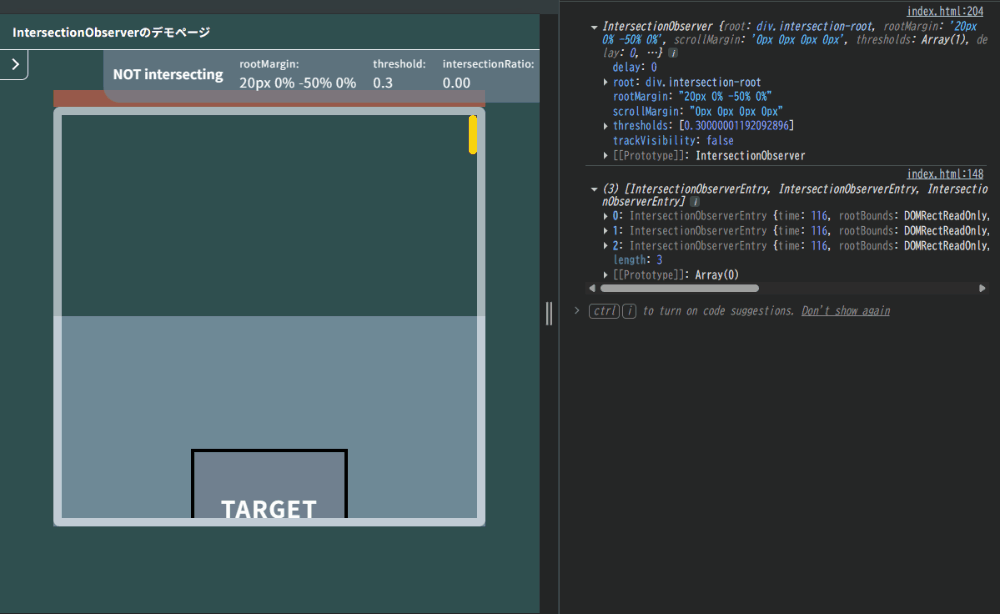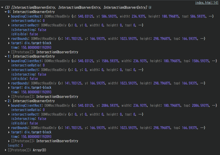 0: IntersectionObserverEntryのように、各監視対象の状態がまとまって入っています。