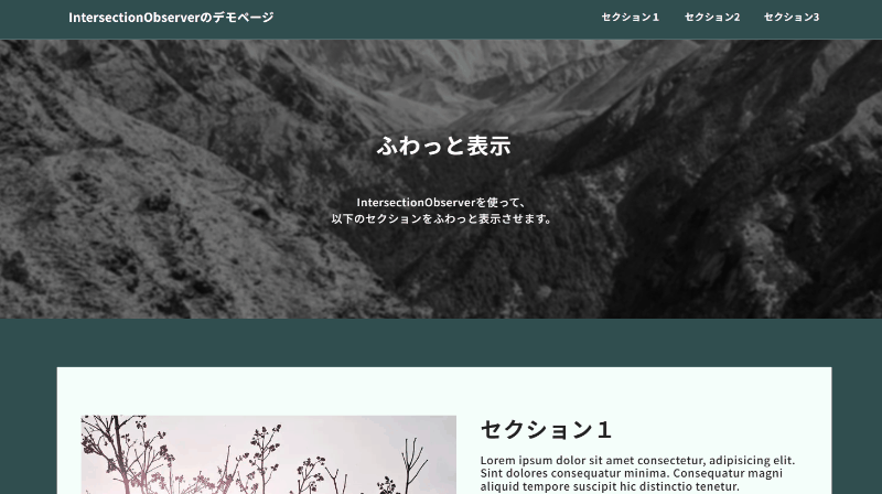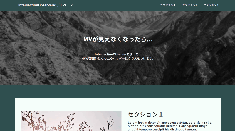 1 2 3 4 5 6 7 8 9 10 11 12 13 14 15 16 17 18 19 20 21 22 23 24 25 26 27 | <header class="io-header"> <div class="inner-block"> <div class="logo-area"> <span class="txt">IntersectionObserverのデモページ</span> </div> <ul class="header-list"> <li><a href="#section-1">セクション1</a></li> <li><a href="#section-2">セクション2</a></li> <li><a href="#section-3">セクション3</a></li> </ul> </div><!-- /inner-block --> </header> <!-- ターゲットにクラス名を付与(今回はjs--io-mv) --> <section class="mv-section section-each js--io-mv"> <div class="inner-block"> <div class="contents-wrap"> <h1 class="ttl">MVが見えなくなったら...</h1> <p class="txt">IntersectionObserverを使って、<br>MVが画面外になったらヘッダーにクラスをつけます。</p> </div> </div> <div class="img-area"><img src="https://picsum.photos/id/29/1920/600?grayscale&blur=2" alt=""></div> </section> |