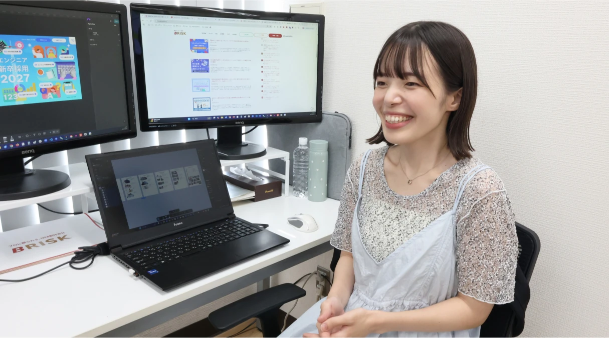 デザインに集中できる環境に加え、BRISKが大切にしている「誠実さ・信頼性」や「チームで成長する」という社風に魅力を感じました。社員同士が協力しながら成果を追求し、クライアントとも誠実に向き合う姿勢に感銘を受けました。面接では、社長や先輩社員の温かい人柄に触れ、自分もここで成長していきたいと思えたことが入社の決め手です。